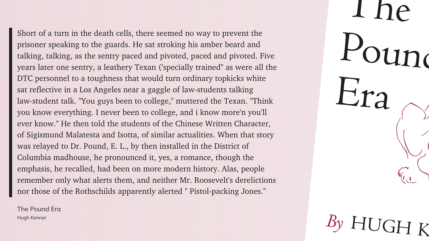 I loved Hugh Kenner’s The Pound Era almost more than I love Pound’s writing—and I’ve read all of it. (I have a soft spot though for Pound’s slender and sumptuous volume called Drafts & Fragments of Cantos CX–CXVII, which is quietly wonderful.) I still think about the Henri Gaudier-Brzeska panther drawing on the title page—one of the sketches he made on his weekly visits to the London Zoo, the perfect opening into the book that gives a lot of love to the sculptor and painter who died much too young. I savored it from start to finish. The Pound Era is a brilliant study of those in chaotic orbit around Pound, shaped roughly like a biography, sympathetic and partisan, but also blunt and honest. The anecdote above is one for the ages.